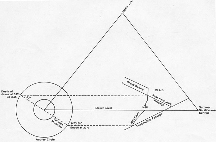 Stonehenge also fits precisely inside The Great Pyramid when both are drawn to scale.  Both structures also share the famous pi angle; 51 degrees, 51 minutes, 14.3 seconds. This is the angle of summer solstice sunrise to north at Stonehenge and the precise angle of each face of The Great Pyramid. The number seven is a recurring theme in The Great Pyramid. As stated earlier, the Pyramid Angle itself (base to apex) as well as the passage angles are the primary angles in a seven-pointed star. Also, if you remember, the scored lines were in alignment with Pleiades or "Seven Sisters", a constellation made up of seven stars. If one were to take a seven-pointed star and overlay it on a drawing of Stonehenge, dividing the Aubrey Circle into seven equal sections of one thousand years each, giving it a complete 360 degree circuit of seven thousand years, some very interesting things begin to take shape. The alignments of the sun and moon can be measured accurately as they intersect the Aubrey Circle, at points marking important dates in recorded biblical history. Using the seven thousand year period that Bible chronologists have determined to be mankind's time on earth, with the summer solstice sunrise alignment serving as the beginning and ending of the circuit, the following results were obtained.