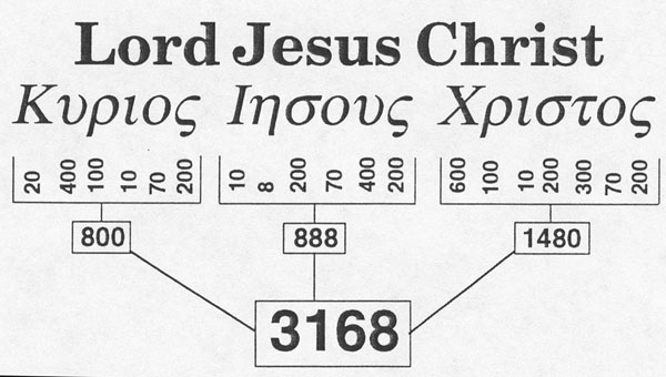 Even more astounding is the placing of the pyramid angle into the summer solstice sunrise angle at Stonehenge with both structures drawn to scale. The exact date of Jesus' death as measured in the first ascending passageway of The Great Pyramid (April 3, A.D. 33), lines up precisely with the date of His death ascertained by the alignment of the Passover (equinox) moonrise at Stonehenge, even forming a 33 degree angle in the process! The Bible states that the evidence from two witnesses shall establish a matter. We here at Greenhouse Designs hope that the information presented above has shed some light on a very complicated and misunderstood subject. GEMATRIA The incredible amount of knowledge the ancients would have needed in order to accomplish what they did simply staggers the imagination. Concerning the previous two chapters above where Greenhouse Designs points out that The Great Pyramid and Stonehenge were built by Divine inspiration, basically as prophesies in stone, there are many people that will still say it can all be explained as coincidence. Some will say both these structures were built with the help of space/time travelers with extraordinary technologies and information. The facts presented below will hopefully give even the most skeptical of us something to seriously contemplate, because once a basic understanding of gematria is realized the whole universe opens up to astonishing mathematical enigmas that go well beyond the realm of statistical probability.It is Greenhouse Designs contention that the information to follow makes a very strong case for a Creator and the intelligent, purposeful design of the universe. Gematria is the cryptographic significance of words, revealing their hidden meaning. It was employed by the Greeks and the Hebrews and is actually quite simple. The characters of both the Greek and Hebrew alphabets were given numerical equivalents; thus, any word, name or phrase had a corresponding number. (It should be noted that in gematria, zeroes at the end of a number and decimal points are disregarded.) For instance, the number equivalent for Lord Jesus Christ is 3168: Bethlehem, the place of Jesus birth, sits at 31.68 N latitude: The perimeter of a square drawn around the earth, enclosing the earth within would be 31,680 miles: