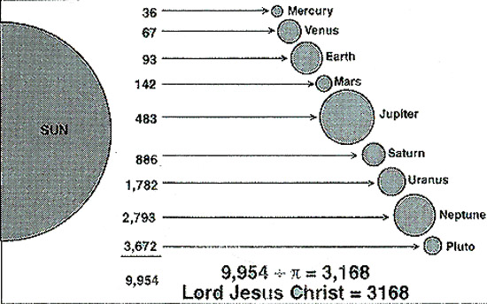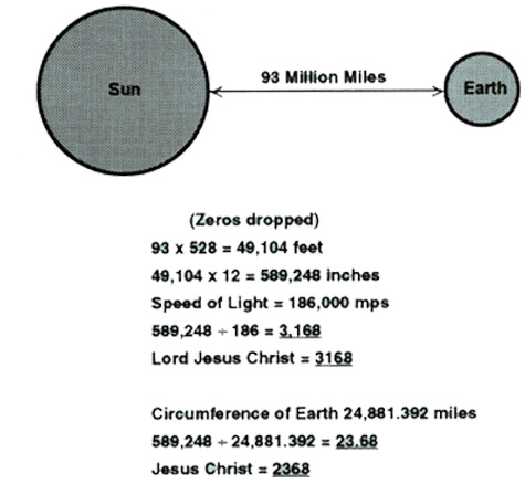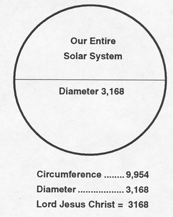 If we draw a Pythagorean 3:4:5 Triangle on the polar and equatorial diameters of the earth, the long side of that triangle would be 3,168 miles:  The latitude of 31.68 N is located on our globe at just the right distance from the equator to produce a golden rectangle. The long side of that rectangle also bears the number of His name using the other spelling for Lord Jesus Christ in Greek:  The mean distance between the sun and the earth is 93 million miles. If we were to convert those 93 million miles to inches, and divide by the speed of light, the result would be 3168, which is the gematria for the name Lord Jesus Christ. The Encyclopedia Britannica lists the mean distance that light travels from the sun to each of the nine planets in our solar system as follows (dropping all the zeroes): The sum of these distances divided by pi equals 3168. In other words, if we added all these distances together and then constructed a giant circle with an equal circumference representing our entire Solar System, the diameter of that circle would be 3168 (Lord Jesus Christ).  We here at Greenhouse Designs believe the information presented above makes a very strong case for a Creator and the intelligent, purposeful design of the universe.